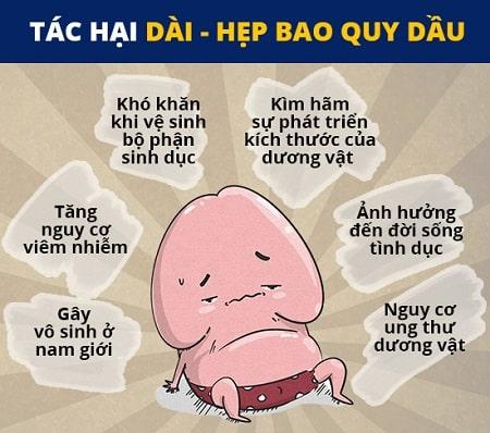 - Hẹp bao quy đầu khiến việc vệ sinh dương vật khó khăn, dẫn đến nước tiểu, các chất cặn bẩn đọng lại bên trong. Tạo môi trường thuận lợi cho vi khuẩn, nấm sinh sôi, phát triển và gây viêm bao quy đầu, viêm niệu đạo…